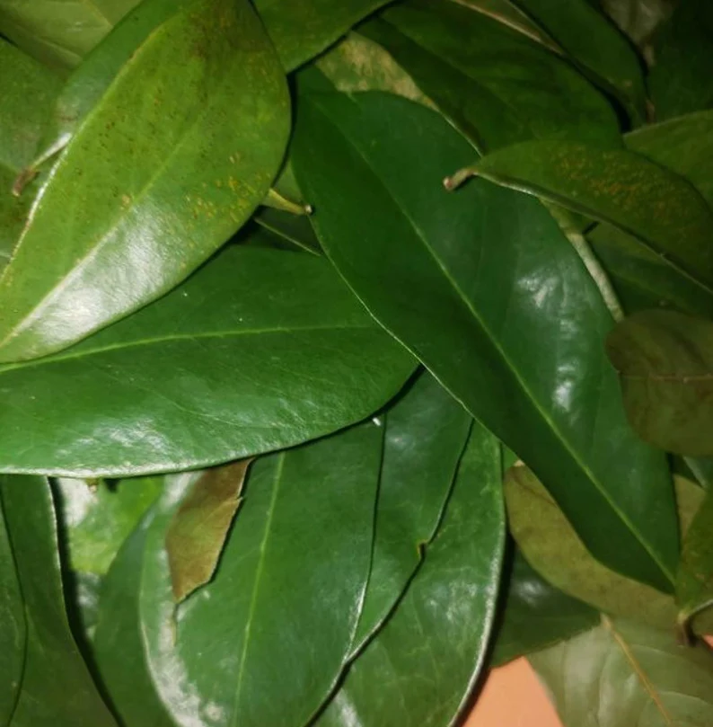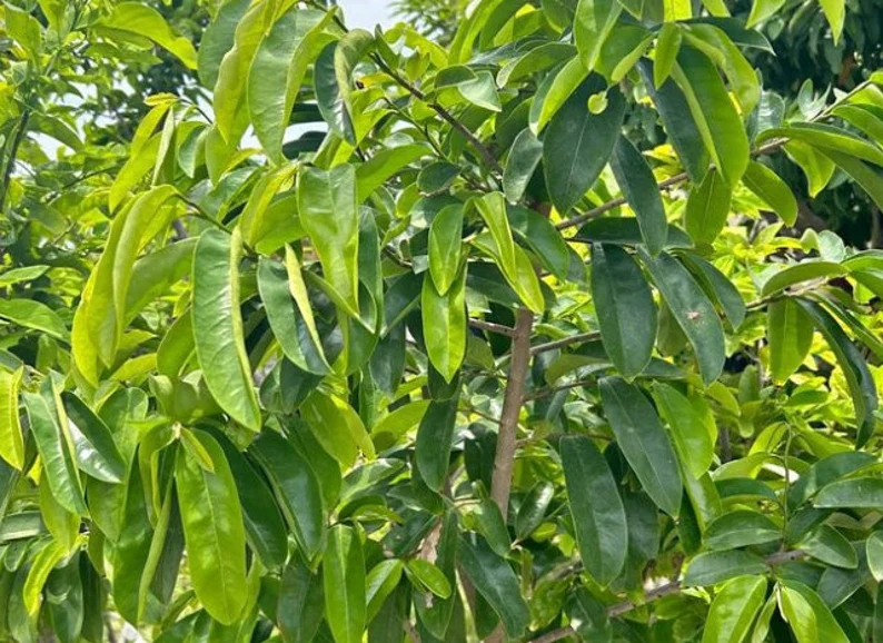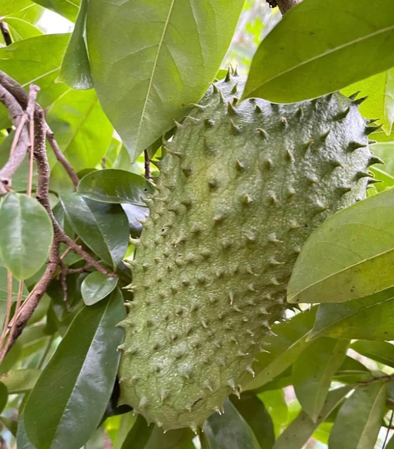Soursop trees are relatively small, reaching heights of about 5 to 6 meters. They have large, glossy, dark green leaves that are oblong or oval in shape. The fruit is typically heart-shaped, covered in a spiky green outer skin, and can weigh anywhere from 2 to 5 kilograms.